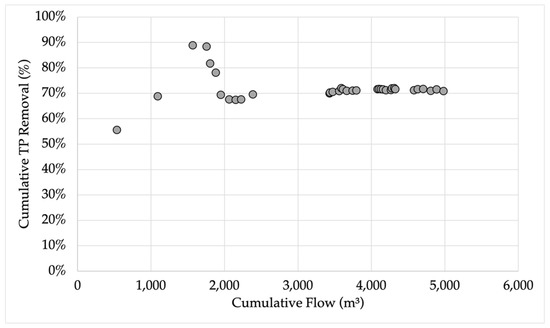 Flow-weighted TP removal calculated cumulatively for each storm event as a function of the cumulative flow that passed through the spent lime DWTR.
