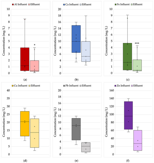 Distribution of event mean concentrations in the influent stormwater and effluent discharge for the metals (a) aluminum, (b) calcium, (c) iron, (d) copper, (e) lead, and (f) zinc. Asterisks represent statistically significant differences in the post-treatment effluent compared to the pre-treatment influent (* = p < 0.05; *** = p < 0.001). If no asterisks are shown, either no significant differences were detected, or the sample size was too small to test for differences.