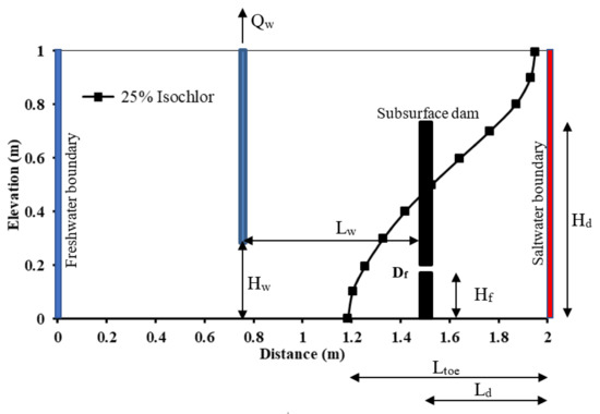 Figure 4a,b shows the saltwater intrusion wedge of the Henry saltwater problem for the steady-state condition and after installing a subsurface dam with a height Hd = 0.60 m to control seawater intrusion at distance Ld = 0.50 m. Figure 4c–g present the saltwater intrusion wedges for a fractured subsurface dam with Df = 0.005 m at a height Hf = 0.1 m and for five different well abstraction rates from equal to 1 × 10−6, 2 × 10−6, 3 × 10−6, 4 × 10−6, and 5 × 10−6 m3/s, respectively.