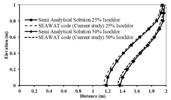 Figure 3 presents the saltwater intrusion wedge for the Henry problem using a semi-analytical solution and the SEAWAT code. The comparison between the two figures confirmed good agreement for the concentration of 17,500 mg/L (50% Isochlor) and the salinity concentration of 7850 mg/L (25% Isochlor). The penetration of sweater intrusion for the salinity concentration of 17,500 mg/L is equal to 63 cm and 65.7 cm for the semi-analytical and SEAWAT code solutions, respectively. In addition, the penetration of sweater intrusion for the salinity concentration of 7850 mg/L is equal to 84.7 cm and 81.5 cm for the semi-analytical and SEAWAT code solutions, respectively. The absolute error of the penetration length of the seawater wedge between the semi-analytical solution and the SEAWAT code is equal to 2.7 cm and 3.2 cm for salinity concentrations of 17,500 and 7850 mg/L, respectively.