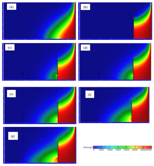 Steady-state saltwater intrusion for: (a) Henry base case; (b) subsurface dam at Ld = 0.5 m with Hd = 0.6 m; (c) Df = 0.005 m, Hf = 0.1 m, Qw = 1 × 10−6 m3/s; (d) Df = 0.005 m, Hf = 0.1 m, Qw = 2 × 10−6 m3/s; (e) Df = 0.005 m, Hf = 0.1 m, Qw = 3 × 10−6 m3/s; (f) Df = 0.005 m, Hf = 0.1 m, Qw = 4 × 10−6 m3/s; and (g,d) Df = 0.005 m, Hf = 0.1 m, Qw = 5 × 10−6 m3/s.