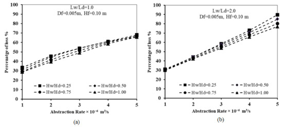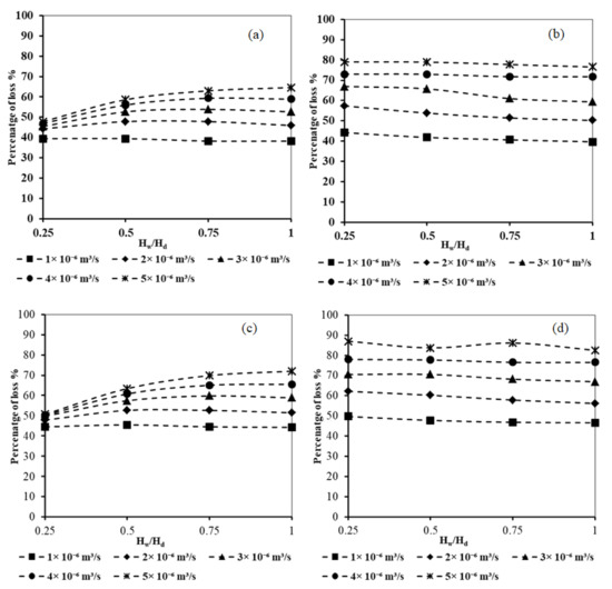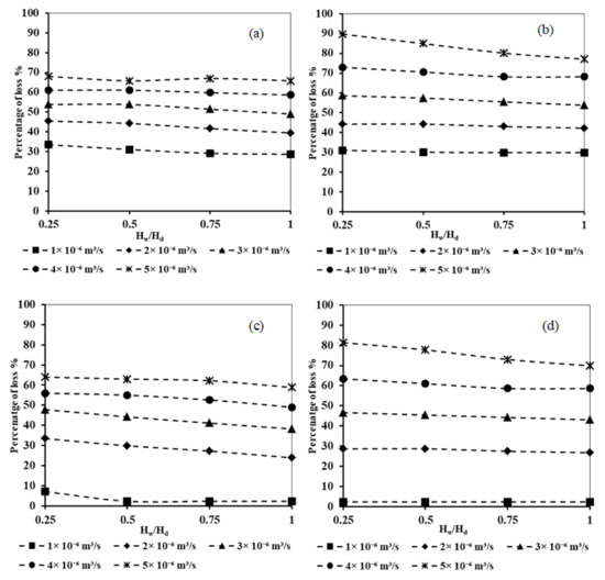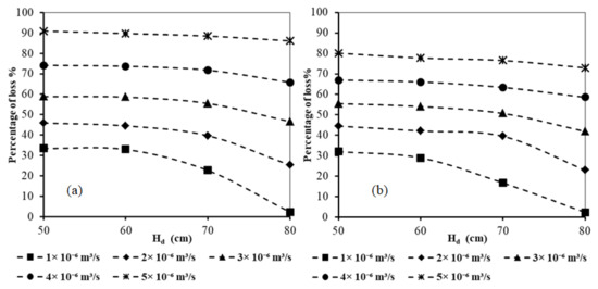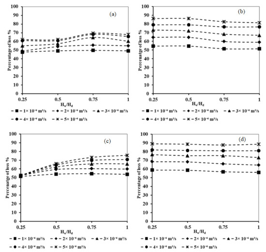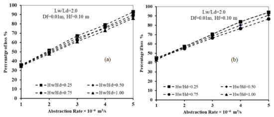 The results of Figure 7 demonstrated that for various values of the dimensionless well height ratio, increasing the well abstraction rate resulted in an increase in the loss of effectiveness of the subsurface dam. For Lw/Ld = 1.0 and Hf = 0.2, for Hw/Hd = 0.25, the loss of effectiveness increased from 30% to 90% when increasing the rate of abstraction from 1 × 10−6 to 5 × 10−6 m3/s, respectively. In addition, for Lw/Ld = 2.0 and HF = 0.2, for Hw/Hd = 0.25, the loss of effectiveness increased from 28% to 82% when increasing the rate of abstraction from 1 × 10−6 to 5 × 10−6 m3/s, respectively.