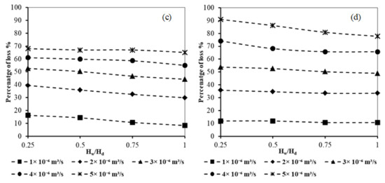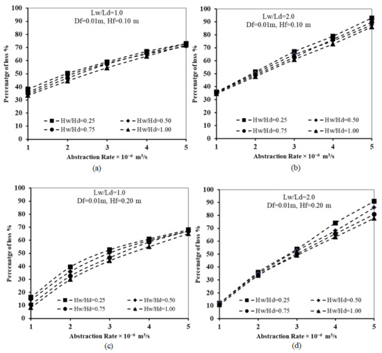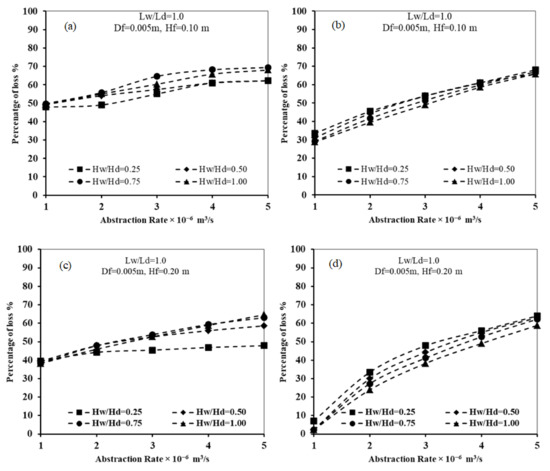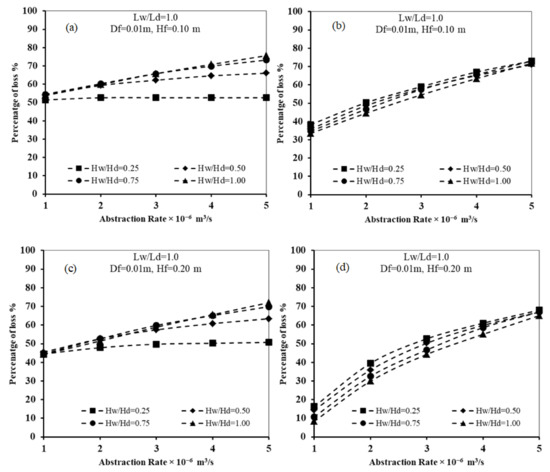 Relation between abstraction well rate and loss of subsurface dam effectiveness for Ld = 0.50 m, Df = 0.01 m, and for different Lw/Ld and Hf: (a) Lw/Ld = 1.0 and Hf = 0.1, (b) Lw/Ld = 2.0 and Hf = 0.1, (c) Lw/Ld = 1.0 and Hf = 0.2, and (d) Lw/Ld = 2.0 and Hf = 0.2.