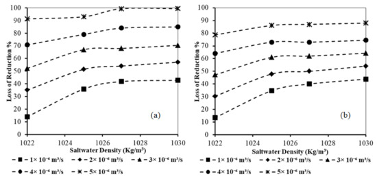 Comparing the findings of results of Figure 16 (for Df = 0.005 m) with Figure 17 (for Df = 0.01 m) confirmed that increasing the diameter of the fracture aperture resulted in an increase in the penetration length of the sweater intrusion wedge, and the loss of effectiveness of subsurface dam increased. For Hf = 0.10 m, the maximum loss of the underground dam’s effectiveness increased from 61.00% to 63.39% for the same abstraction rate of 5 × 10−6 m3/s for Df = 0.005 m and Df = 0.01 m, respectively. For Hf = 0.20 m, the maximum loss of the underground dam’s effectiveness increased from 58.61% to 61.72% for the same abstraction rate of 5 × 10−6 m3/s for Df = 0.005 m and Df = 0.01 m, respectively.