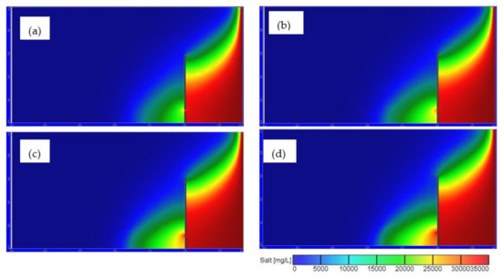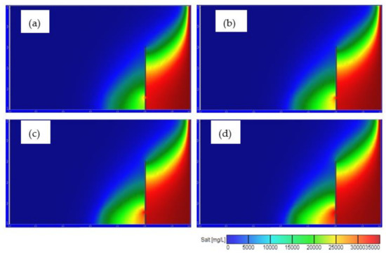 Salinity distribution for Df = 0.01 m, Hf = 0.1 m, Ld = 0.5 m for different values of saltwater density: (a) 1025 kg/m3 (b) 1025 kg/m3, (c) 1027 kg/m3, (d) 1030 kg/m3.