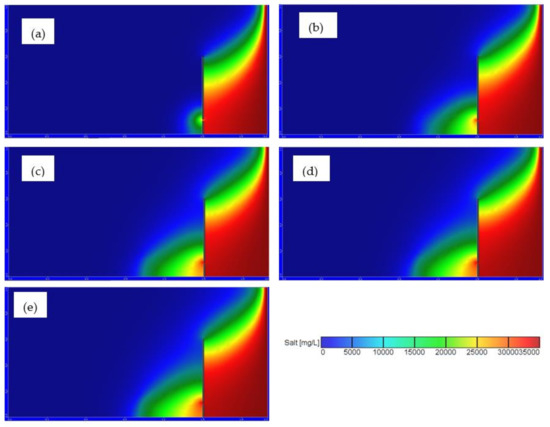 Trasnient seawater intrusion for Df = 0.005 m, Hf = 0.1 m, Ld = 0.5 m, Hw/Hd = 0.25, Qw = 5 × 10−6 m3/s for well location ratio Lw/Ld = 1.0 at time transient time: (a) 5 (b) 25, (c) 50, (d) 75, and (e) 100 min.