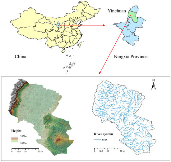 Yinchuan, as the capital of Ningxia Hui Autonomous Region, is an important central city in Northwest China, and an important trade town on the ancient Silk Road. By the end of 2020, Yinchuan had a total area of 9025.38 km2, and a resident population of 2.29 million. On the water resources situation, the average annual precipitation in Yinchuan is only 210 mm. The Yellow River flows through the center of Yinchuan, bringing a large number of water resources, as nearly 90% of urban water comes from the Yellow River. The per capita available water resource in Yinchuan is 640 m3, which is 1/11 of the global per capita. Yinchuan crosses the northwest arid region and the eastern monsoon region, so it has various types of ecological uses. However, the natural ecosystem function of Yinchuan is on the low side, and the ecological environmental capacity is small. Its human activities have a strong influence on the environment, and in some areas cause serious environmental degradation. In terms of energy exploitation and processing, there is a large national coal production base, the “West-to-East Power Transmission” thermal power base and coal chemical industry base in Yinchuan. In terms of food planting, Yinchuan is located in the Yellow River irrigation area, which is an important food planting area. The location, terrain, and water system in Yinchuan are shown in Figure 1.