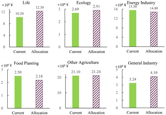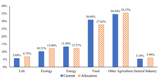 A comparative analysis is made between the current water rights of various industries in Yinchuan in 2019 and the allocated water rights in various industries based on the coordinated development of water–ecology–energy–food in this paper, as shown in Figure 4.