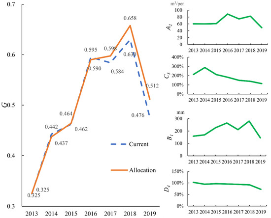 As can be seen from Figure 3, in terms of the extended development trend of the water–ecology–energy–food coordinated development index, except that the current water rights declined in 2017, the current indexes and the allocated indexes basically showed an upward trend from 2013 to 2018. Both dropped significantly in 2019 compared to the previous year. Through the analysis of comprehensive evaluation indicators data, it is found that natural annual precipitation (B1) decreased significantly in Yinchuan in 2019, and the energy exploitation and food crop yield was decreased. As the result, the per capita water resources (A1), energy self-sufficiency rate (C3) and food self-sufficiency rate (D4) and other positive indicators decreased significantly, which has an impact on the coordinated development index in this year. The coordinated development index under the current water rights condition has a slight decline in 2017, which is due to the obvious decline of annual precipitation (B1) in this year compared with 2016.