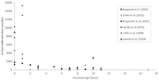 Surface infiltration rate versus age of PICPs (non-porous), as recorded in various past studies. (Collin et al. [6], Drake et al. [7], Boogaard et al. [10], Borgwardt et al. [11], Cipolla et al. [12], and Sañudo-Fontaneda et al. [13]).