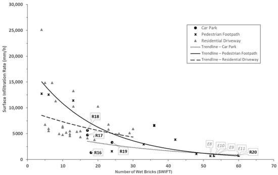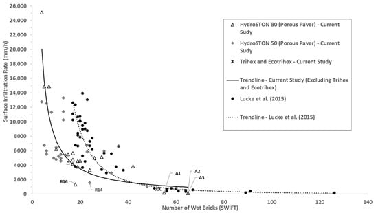 Figure 2 shows that the trendline for the data collected in this study is different from that of Lucke et al. [14]. The data of Lucke et al. [14] fits better to its trendline (R2 = 0.85) than that of the present study (R2 = 0.53). While both trendlines have the same form, the trendline of data of the present study shows that infiltration occurs through a smaller number of bricks than the trendline of the data of Lucke et al. [14]. The data from the present study are predominantly for HydroSTON pavers, which are porous to create a fully permeable surface area. Lucke et al.’s [14] data is for non-porous pavers where infiltration only occurs through the gaps between the pavers. Nonetheless, where the number of bricks exceeds approximately 45 pavers, the situation appears to reverse, although this region is not well defined with few HydroSTON data. The Trihex and Ecotrihex (non-porous pavers) data collected in this present study fit well with the Lucke et al. [14] trendline, as they are similar non-porous paver systems.