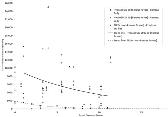 Infiltration rate versus the age of PICPs with both porous and non-porous pavers.