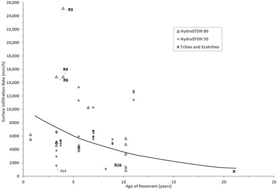 Infiltration rate versus age of pavement for all field measurements conducted in this study.