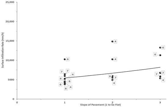 Effect of slope of pavement: Figure 6 plots the infiltration of PICPs against the slope of the pavement. Note that the slope was measured by eye-estimate and given a rating that ranged from flat/gentle (rating = 1), medium (rating = 2) and steep (rating = 3), a form of classification that may have exacerbated the scatter. In addition, 4–7 year old pavements were selected for this plot because this was the range where the amount of data was the largest. In the figure, the callout labels show the age of the pavers. The figure shows that infiltration is higher where the slope is medium/steep compared with a flat/medium slope. This may be explained by a self-cleaning effect where debris that would otherwise clog pavements are more easily washed/blown away off steeper slopes.