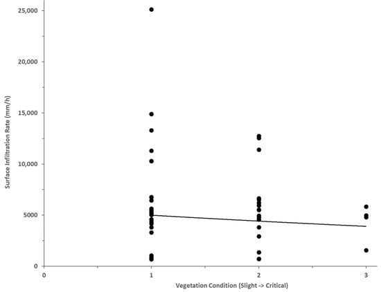 The data collected in the present study show more variability than those of Lucke et al. [14], evident from the lower R2 coefficient for the trendline of the present data. The data of this study were collected from sites with a more heterogeneous range of conditions (see Table S1). Apart from the predominant paver type in the study being porous pavers, which in Lucke et al.’s study [14] were non-porous, other factors that could lead to the differences in the measured infiltration rates include the slope of the pavement surface; age of pavers; sub-grade structure including soil type, its saturation and water table levels; quality of construction; operating conditions including size and type of clogging materials and vegetation cover, vehicular and pedestrian loads; and frequency and quality of maintenance. The following sections highlight differences in test conditions between the two sets of data.