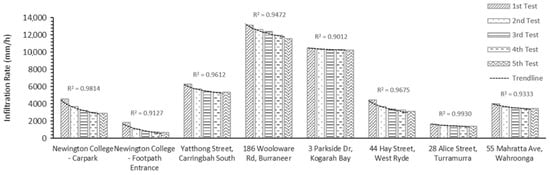 The greatest reduction in PICP infiltration rates occurred at the residential driveway of 186 Wooloware Roadd, Burraneer, with a change of 1571 mm/h between the first and fifth repetition, or a 12% reduction (Figure 8). The greatest percentage reduction was found at the footpath entrance of Newington College, Stanmore, with a 63% reduction in infiltration rate observed. These results are consistent with the conclusions presented by Boogaard et al. [17], Razzaghmanesh and Beecham [30], and Borgwardt [11], that the PICP infiltration rates decline with time during extended testing due to saturation of the system. The test shows that the drop in infiltration can be high, and possibly explain some of the scatter observed in Figure 2.