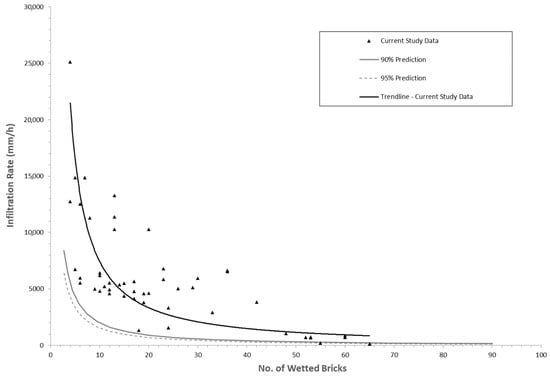Prediction limits were derived based on the data collected in this study and by Lucke et al. [14]. These were determined by assuming that (a) the data can be fitted with a power function (equivalent to a straight-line fit on the logarithms of the data points), and (b) the distribution of points about the fitted line is normal. A total of 90% and 95% of measurements of infiltration rates and wetted bricks, respectively, should fall above the two prediction lines shown in Figure 9.