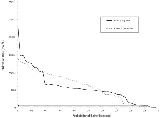This raises the question about an infiltration rate suitable for the design of PICPs and if it can be derived from all of the data collected. Tests show that all of the sites provide very high infiltration rates, with the lowest being approximately 125 mm/h for both the current study and the study of Lucke et al. [14]. This, at least, provides an empirical basis for choosing an infiltration rate for the design of PICPs. Further guidance on the infiltration rate for design can be obtained by exploring the probability of exceedance of the data, see Figure 10. Taking the infiltration rate that is exceeded in 90% of cases, the data collected in this study gives a value of 700 mm/h and Lucke et al.’s [14] data gives 400 mm/h. Both of these are high infiltration rates. Based on this, the lower value of 400 mm/h could be assumed for design purposes, based on field measurements in the Sunshine Coast, Sydney and Wollongong.