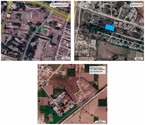Lahore is located in northeast Pakistan and is the second-largest city in Pakistan in terms of population, with an annual population growth rate of 4.07%. It lies in a semi-arid climatic region with warm weather in summer. Monsoon (heavy rainfall season) usually starts in this region in late June. To investigate the quality of rainwater samples, three different sites were selected for rainwater sample collection across the city ranging from urban to rural areas. Recharge wells are installed at the study sites to investigate the physicochemical parameters of the collected rainwater samples. The rainwater samples were collected and divided into three categories (i.e., direct capture, rooftop runoff, street runoff). Details of the selected sites and their respective locations are presented in Table 1. Aerial maps of the study sites are presented in Figure 1. The profile of mean rainfall at the study sites is presented in Figure 2. According to Figure 2, monthly rainfall peaks at up to 307 mm/month during the monsoon season.