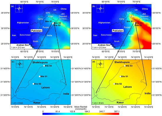 Profile of mean rainfall at the study sites where (a,c) represent June 2018, and (b,d) represent July 2018.