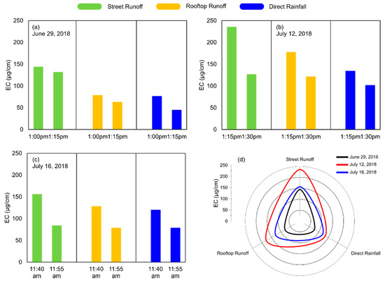 Profile of electrical conductivity (μg/cm) in harvested rainwater at Site S1—Irrigation Research Institute, Irrigation Department, Lahore, Pakistan, where (a) represents 29 June 2018, (b) represents 12 July 2018, (c) represents 16 July 2018, and (d) illustrates comparative analysis of the three selected dates on polar chart.