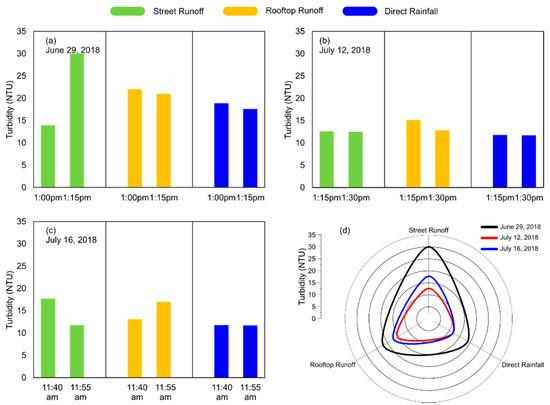 Profile of turbidity (NTU) in harvested rainwater at Site S1—Irrigation Research Institute, Irrigation Department, Lahore, Pakistan, where (a) represents 29 June 2018, (b) represents 12 July 2018, (c) represents 16 July 2018, and (d) illustrates comparative analysis of the three selected dates on polar chart.