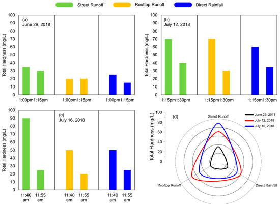 Profile of total hardness (mg/L) in harvested rainwater at Site S1—Irrigation Research Institute, Irrigation Department, Lahore, Pakistan, where (a) represents 29 June 2018, (b) represents 12 July 2018, (c) represents 16 July 2018, and (d) illustrates comparative analysis of the three selected dates on polar chart.
