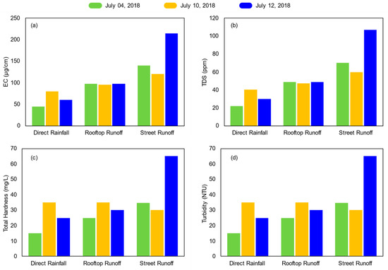 Results of analyses (presented in Figure 3, Figure 4, Figure 5 and Figure 6) for Site 1 (S1) (i.e., Irrigation Research Institute, Irrigation Department Old Anarkali, Lahore, Pakistan) indicated that turbidity values of direct rain samples collected were in the range of 8.7 NTU to 19 NTU, while those from a rooftop in the range of 11.2 NTU to 22 NTU and of those samples collected from the street were in the range of 11.7 NTU to 64.2 NTU, as shown in Table A2, Table A3 and Table A4. The pH of direct rainwater samples of seven events collected was in the range of 6.2 to 6.6, while those from a rooftop were in the range of 6.2 to 6.6. pH values of rainwater samples collected from the street were in the range of 6.2 to 6.7. It was found that the electrical conductivity of direct samples was in the range of 45.0 µs/cm to 143 µs/cm, while those collected from the rooftop and street rain samples were in the range of 63.0 to 177 µs/cm and 84.0 to 285 µs/cm, respectively. The Total Dissolved Solids (TDS) value found from direct rainfall samples was in the range of 22 to 71 ppm, while those collected from the rooftop were in the range of 31 to 88.0 ppm. TDS values of street rain samples were in the range of 42 to 142 ppm. It was observed that the chloride values of direct rain samples, rooftop rain samples, and street rain samples were in the range of 0.1 to 0.7 me/L, 0.1 to 0.5 me/L, and 0.2 to 0.7 me/L, respectively. Carbonate values of direct rain samples, rooftop rain samples and street rain samples were found to be nil. The results indicated that bicarbonate values of direct rain samples, rooftop rain samples and street rain samples were found to be in the range of 0.1 to 0.8 me/L, 0.2 to 0.5 me/L and 0.2 to 0.6 me/L, respectively. Calcium plus magnesium values of direct rain samples were found to be in the range of 0.2 to 1.0 me/L, while those collected from the rooftop and street rain samples were in the range of 0.3 to 1.3 me/L and 0.4 to 1.8 me/L, respectively. Total hardness values were observed in the range of 10 to 65 mg/L, 15 to 70 mg/L, and 20 to 90 mg/L for direct rain, rooftop and street rain samples, respectively, as shown in Table A3, Table A4 and Table A5. Overall results of the analysis indicated that except for turbidity, all of the parameters were below the WHO recommendations for drinking water quality. Additionally, the in-detail results are presented in Appendix A.
