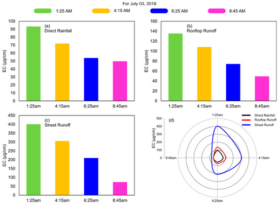 Intraday profile of electrical conductivity (μg/cm) (on 3 July 2018) at Site S3—Field Research Station Babakwal, Tehsil Ferozewala, District Sheikhupura, where (a) represents direct rainfall, (b) represents rooftop runoff, (c) represents street runoff, and (d) illustrates comparative analysis of the three selected categories on polar chart for different rainfall events.