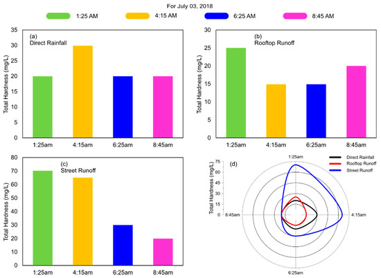 Intraday profile of total hardness (mg/L) (on 3 July 2018) at Site S3—Field Research Station Babakwal, Tehsil Ferozewala, District Sheikhupura, where (a) represents direct rainfall, (b) represents rooftop runoff, (c) represents street runoff, and (d) illustrates comparative analysis of the three selected categories on polar chart for different rainfall events.