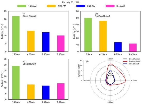 Intraday profile of turbidity (NTU) (on 3 July 2018) at Site S3—Field Research Station Babakwal, Tehsil Ferozewala, District Sheikhupura, where (a) represents direct rainfall, (b) represents rooftop runoff, (c) represents street runoff, and (d) illustrates comparative analysis of the three selected categories on polar chart for different rainfall events.