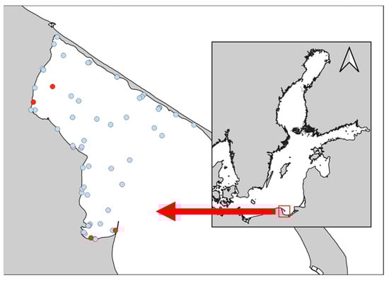 The Gulf of Gdańsk has been significantly degraded as a result of extensive exploitation of marketable species (plants and fish) from late 1950 to 1970 combined with strong eutrophication and pollution limiting the growth of organisms [1,2,3,4,5]. Multifaceted pressures contributed to the disappearance of economically valuable species, e.g., in Puck Bay (shallow-water basin of the Gulf of Gdańsk), Fucus vesiculosus Linnaeus, was last observed in 1977 and Furcellaria lumbricalis in 1979, and a reduction in the total phytobenthos biomass by 15.6% between 1979 and 1987. Impoverished communities were dominated by Pylaiella littoralis (Linnaeus) Kjellman and Ectocarpus siliculosus (Dillwyn) Lyngbye (Ectocarpaceae) as well as Zannichellia palustris L. (Spermatophyta) [5]. Despite this, the Gulf of Gdańsk, especially the eastern part of Puck Bay, is still considered a region of exceptional environmental conditions (low mean depth of 2 m, stable low salinity of approximately 7 PSU and relatively low waves and weak currents) and high biodiversity in comparison with adjacent regions [6]. Therefore, to protect endangered habitats and species, the lagoon has been designated as a Special Protection Area (PLB 220005) and Special Area of Conservation (PLH 220032) as described in the EU-wide network of nature protection areas Natura 2000, and actions were taken to protect the environment and endangered habitats and species, e.g., construction of sewage treatment plants and restitution programs of fish and Zostera marina (Spermatophyta). The regeneration of some ecosystem elements and a general increase in water quality in the region have been confirmed by scientific research [7,8] and the reports of the National Monitoring Programme [9], but some fish stocks are in strong decline due to overfishing and bacterial infections [9,10,11].