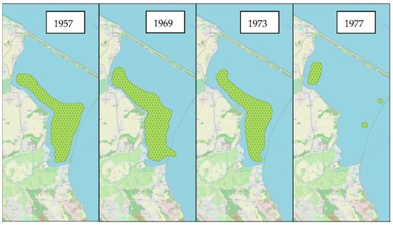 The occurrence of Furcellaria lumbricalis form aegagropila (formerly named Furcellaria fastigiata (Turner) J.V. Lamouroux) together with Coccotylus brodiei was estimated in 1957 and 1968 to be approximately half of the Puck Bay region (Figure 5). According to estimates from 1957, the fresh weight of Furcellaria lumbricalis was 148 g·m2–728 g·m2 (in the region planned for exploitation on average 467 g·m2) and that of Coccotylus brodiei was 1–14 g·m2 [25].