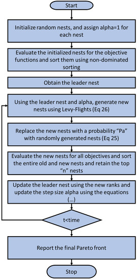 The flowchart of the working mechanism of SAMOCSA is shown in Figure 1. The first step is to initialize algorithm parameters, which generates the initial nests (population) using uniform random distribution within the search space, and also evaluates the generated random nests and store the corresponding objective function values. The next step is to obtain the leader nest, which belongs to the first Pareto front and has highest crowding distance after non-domination sorting of the initial nests. The non-domination sorting is inspired from the NSGA-II algorithm. The next step is to generate the new nests using Levy flight random walk and update the nests. Then, the new nests are replaced with generated nests with a discovering probability “Pa”. After updating the population, these steps are repeated until maximum number of iterations initialized at the start. The “Pa” value is dynamically adapted using the Equation (27). The step-length “alpha(α)” is updated using the current rank (Pareto front number) and crowding distance and also the nests in the first Pareto front. The step-length changes are based on the conditions shown below (Equation (28)).