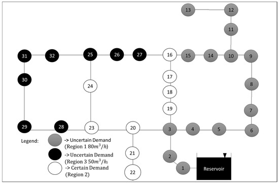 To model uncertainty in demands, the WDS nodes were partitioned into three demand regions: region 1—nodes 1:15, region 2—16:24, and region 3—25:32 (Figure 2). Demands in region 2 were assumed to be certain and in regions 1 and 3 as uncertain with a standard deviation of 12% from the mean demand of each region, (i.e., 80 and 50 (m3/h), respectively. Four different protection levels are studied . Furthermore, the correlation between the nodes within the region and the correlation between the regions are also altered. The intraregional correlation values are set to be and the interregional correlation varies between positive, no correlation and negative correlation . SAMOCSA algorithm is used to solve the outer design problem, and the fmincon algorithm is used to solve the nonlinear inner optimization problem for minimization of the resilience index within the demand search space.