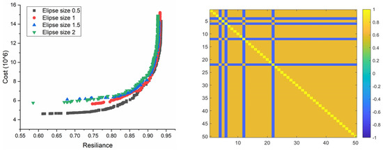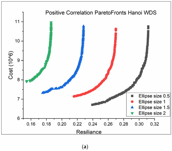Figure 3a–c and Table 3 show the variation in the design Pareto fronts with changes in the uncertainty sets and correlation between the demands of consumer nodes. The Hanoi network is a low resilient network; the variation in protection levels significantly affects the design Pareto fronts can be inferred from the graphs. With the increase in the protection levels, higher design costs are required to satisfy even minimum resilience levels. Among the three cases, a positive correlation between the demands shows the highest effect on the designs, followed by negative and no correlation, respectively. For the no correlation case, the effect of an increase in the protection levels seems to have little variation in the cost for low resilient designs compared to high resilient designs.