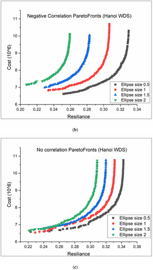 (a) Graph showing the WDS design Pareto fronts for Hanoi WDS with demand variation with positive correlation; (b) graph showing the WDS design Pareto fronts for Hanoi WDS with demand variation with negative correlation; (c) graph showing the WDS design Pareto fronts for Hanoi WDS with demand variation with no correlation.