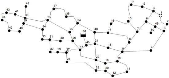 This network is a much larger network based on a real-life WDS (Figure 4) introduced by Alperovits and Shamir [43]. All the demand nodes are assumed to be uncertain with a specified covariance matrix. The network system is shown in Figure 3. The network consists of 52 nodes and 65 pipe segments. The two pumping stations in the original network are removed, and the reservoir head is increased to 410 m to balance the energy supplied by the pumps. The minimum pressure head required at every node is 30 m in addition to the elevation of the nodes. The design search space consists of 11 different pipe sizes (Table 4) for each pipe segment. The Hazen–Williams coefficient is fixed at 130.