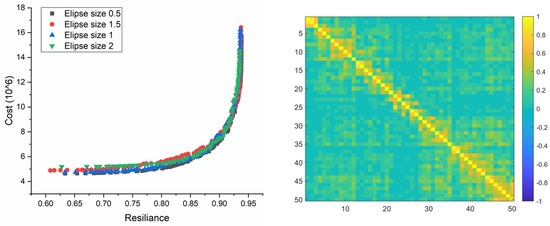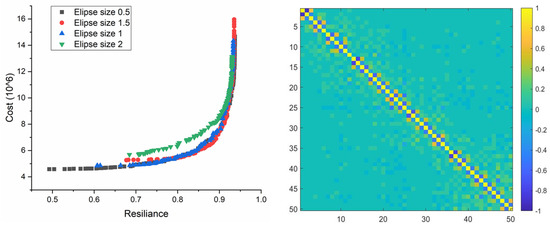 All the demands are considered uncertain, and the mean demands are assumed to be base demands mentioned in Table 9d in Alperovits and Shamir [43]. The input file for this network is attached as supporting material. The standard deviation from the means is assumed to be 20% for each node. The unit cost of the available pipe diameters is shown in Table 3. The co-variance between the demand nodes is assumed to be completely heterogenous. Three different co-variance matrices are evaluated with correlations between −0.3 to 0.8 as shown in Figure 5, Figure 6 and Figure 7.