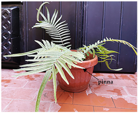 Samples of all fronds were collected from plants grown in S1 (58 mg/kg DW, Dried Weight), and S2 soils (750 mg/kg DW) at 0, 30 and 60 days, and 0, 30 and 45 days, respectively. In detail, a pinna for each frond was collected from 4 different plants, dried for 48 h at 37 °C and then ground in a mortar into a fine powder (Figure 2).