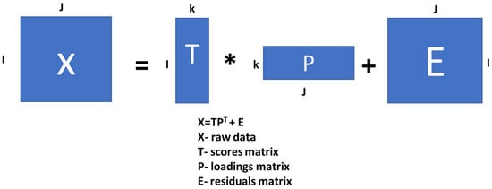 Usually, all the data intended for processing are compiled in matrix form. In this matrix (typically called X), each row contains raw data (variables) describing each sample [39]. In this case study, the variables of XRF data were the concentration values of elements for each sampling day. In geometrical terms, the X matrix represents the data of all studied samples in J-dimensional space, where J is the number of variables describing each sample. PCA is the decomposition of the X matrix into the product of the scores of matrix T and transposed loadings of matrix P plus the residuals of matrix E. The diagram in Figure 4 summarizes how PCA works.