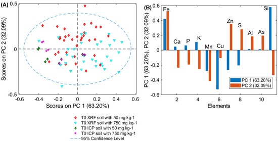 PCA (A) score and (B) loading (PC1, PC2) plots of µXRF and ICP–OES data for T0 samples for plants grown on soil S1, S2.