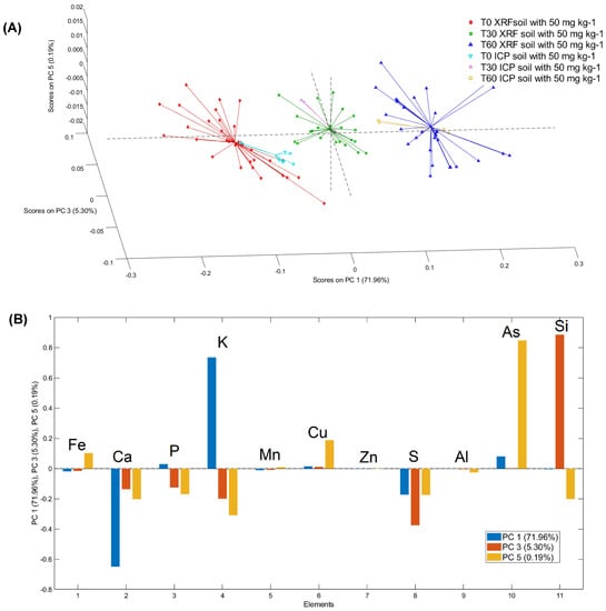 PCA models were created for evaluating the variance of each µXRF with ICP–OES measurements. The PCA score plot of fronds grown on S1 soil shows a good level of overlap between the ICP–OES data and the µXRF data obtained for each sample. In detail, PCA, applied to the pinna powder data, shows good separation for each time point (Figure 6). The total variance captured was 99.91%, with five principal components (PC). The score plot of PC1, PC3 and PC5 highlights three different clouds corresponding to three different compositions of the examined powders. PC1 allows evaluating the differences between the element content of pinna powders at times 0 and at times 30 and 60. PC3 highlights the difference between pinna powders at times 30 and other sample times. Lastly, PC5 shows the greatest variation for an increase in As (Figure 6A). The loading plot allows for interpretation of the observed grouping in terms of elemental composition. In detail, by analysing the loading plot, it is possible to highlight the weight of the macro and micronutrients detected in the pinna powders for each sampling day considered. The positive values of PC1 are mainly due to K, while the negative values are mainly due to calcium (Ca) and sulphur (S). The positive values of PC3 are mainly due to Si, while the negative values of PC3 are due to S, potassium (K), phosphorus (P), and Ca. Lastly, the positive values of PC5 are mainly due to the variance in As, as well as in Cu and Fe, while negative values are mainly due to the combined variance of K, P, Ca, S and silicon (Si) (Figure 6B).