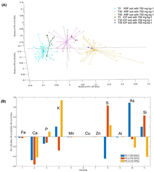 3D PCA (A) score and (B) loading (PC1, PC2, PC3) plots of the µXRF and ICP–OES data for T0, T30 and T45 for plants grown on soil S2.