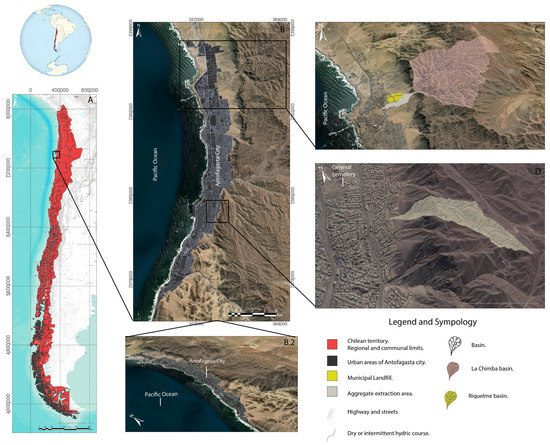 Location map. (A) Indicates the location of Chile on a country scale. (B) Indicates the location of the city of Antofagasta, Antofagasta Region. (B.2) Indicates the location of the city of Antofagasta with a 3D view. (C) It is the location of the La Chimba basin with a 3D view. (D) It is the location of the Riquelme basin with a 3D view (validation method).