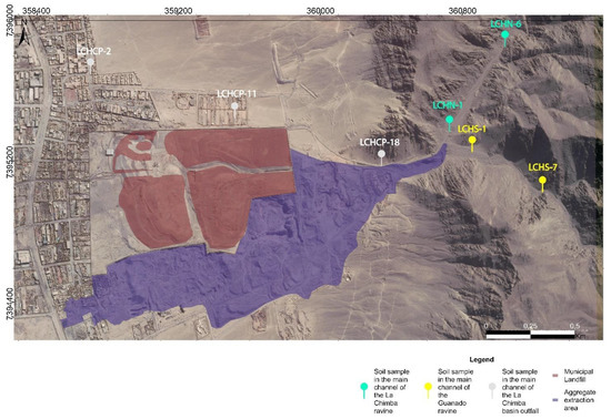 Location of pits and soil samples in the study area. The white points and codes indicate samples from the mouth area, light blue points indicate Guanaco sub-basin samples and yellow colors indicate La Chimba sub-basin samples. The brown color represents the Municipality Dump. The purple area represents a sedimentary material extraction zone and ground modification.