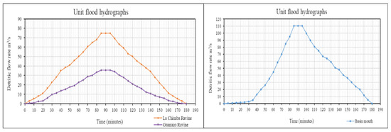 There is constructed the debris flow hydrograph considered for the basin mouth area. For this, the volumetric concentration parameters, concentration times, runoff coefficient, and liquid and debris flows were determined for La Chimba and Guanaco sub-basin, respectively (Table 7).