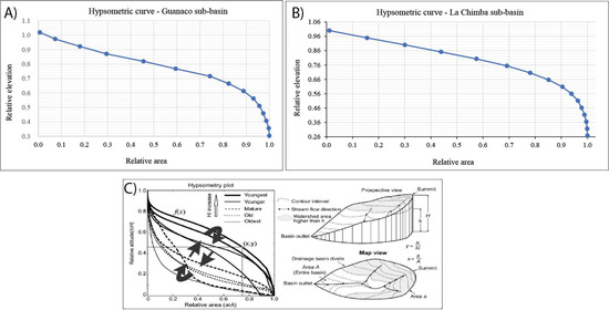 The morphometric analysis, in this case, corresponds to a quantitative analysis of the hydromorphological response of the basin. It was proposed to determine parameters of shape, drainage network, relief and complementary for the definition of hydrologic response of the basin and the ease with which said flow drains towards of the mouth [40,47,48,49,50,51]. Appendix D shows the methodological summary and parameters used in this study. It should be noted that this characterization was carried out using Digital Elevation Models (DEM) of 12.5 m resolution with ArcGIS Pro V2.9.0 geoprocessing and ArcGIS ArcMap Desktop V10.8.2 (ESRI, Redlands, CA, USA).