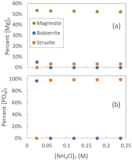 The increase in the proportion of [Mg]T in the form of MgCl+ with increasing [NH4Cl]T corresponded to a decrease in the proportion of dissolved [Mg]T in orthophosphate complexes (Figure 5), essentially freeing orthophosphate to form struvite. Specifically, the decrease in the concentrations of MgH2PO4+, MgHPO4, and MgPO4−, (total decrease in concentration: 3.65 × 10−5 M), especially MgHPO4 (decrease in concentration: 3.48 × 10−5 M), accounts for 72% of the decrease in dissolved [PO4]T (decrease in dissolved [PO4]T: 5.04 × 10−5 M) as [NH4Cl]T increased from 0.0236 M to 0.236 M (Table 1 (IDs 5–7 and 21); Figure 5). Accounting for the complexation of Mg with orthophosphate species (i.e., PO43−, HPO42−, and H2PO4−, and especially HPO42− in the pH range where it is the predominant orthophosphate species (approximately pH 7–12)) is needed to correctly predict the solubility of magnesium phosphate minerals such as struvite [28,29].