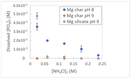 Next, we examined equilibrium speciation of dissolved [PO4]T, [NH4]T, and [Mg]T using MINEQL+ for insights into why aqueous phosphorus concentrations decreased with increasing [NH4Cl]T. Because [PO4]T was present in the lowest molar concentrations relative to [NH4]T and [Mg]T, it is likely that phosphorus removal by precipitation was driven by dissolved phosphorus speciation, so we examined this further. MINEQL+ output indicates that as [NH4Cl]T increased from 0.0236 M to 0.236 M for Mg char at pH 8, the concentration of the aqueous species MgCl+ increased significantly due to the ten-fold increase in the concentration of added Cl− (the counterion to NH4+), as shown in Table 1 (ID 8) and illustrated in Figure 5 (which shows only magnesium phosphate and magnesium chloride complexes for clarity). Trends in the concentration of MgCl+ were similar for Mg char and Mg silicate at pH 9 (Table A5 and Table A6 (ID 8)).